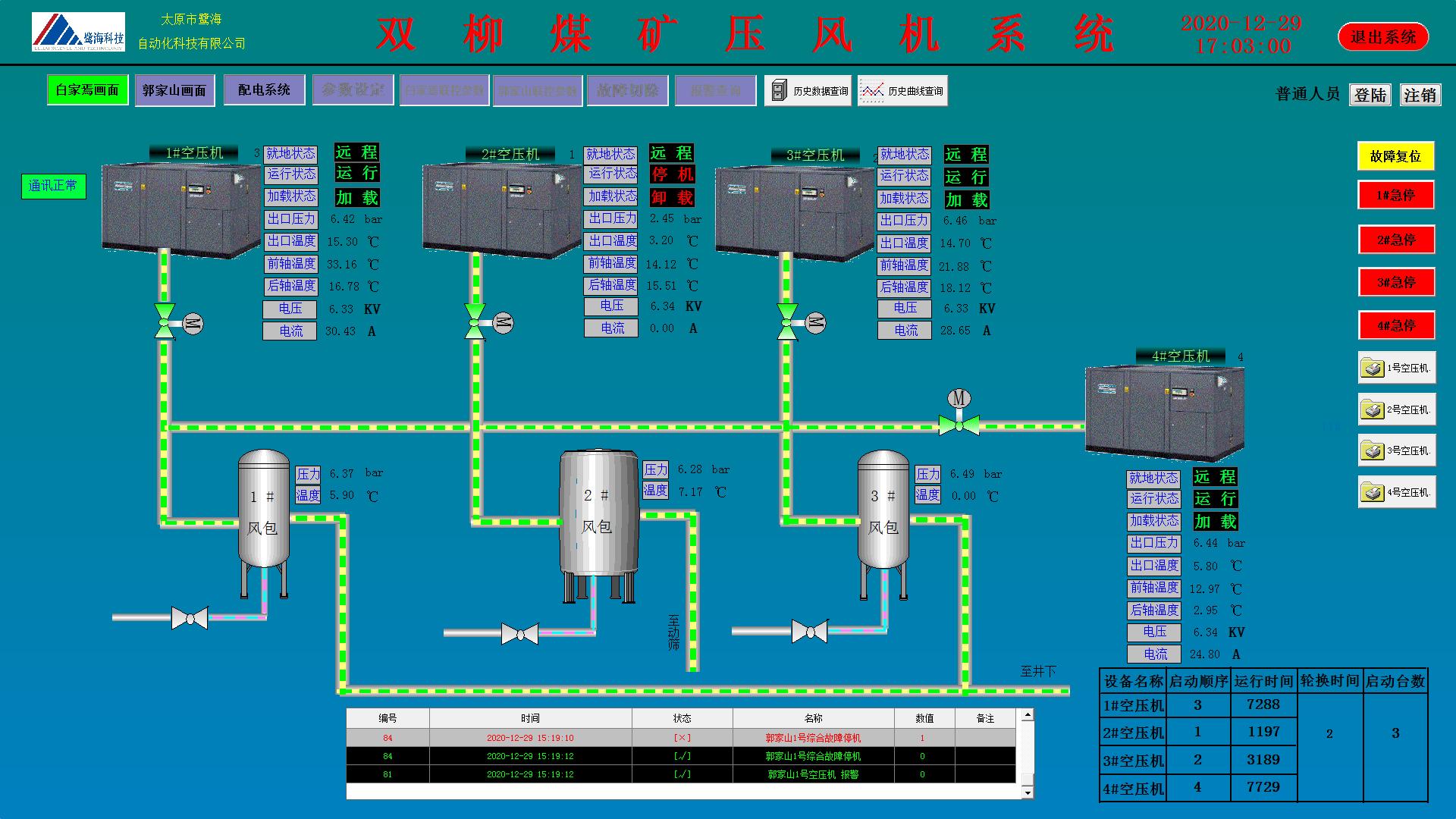 實(shí)現(xiàn)壓風(fēng)機(jī)方各重要設(shè)備運(yùn)行狀態(tài)實(shí)時(shí)監(jiān)測(cè)、故障報(bào)警與聯(lián)動(dòng)控制